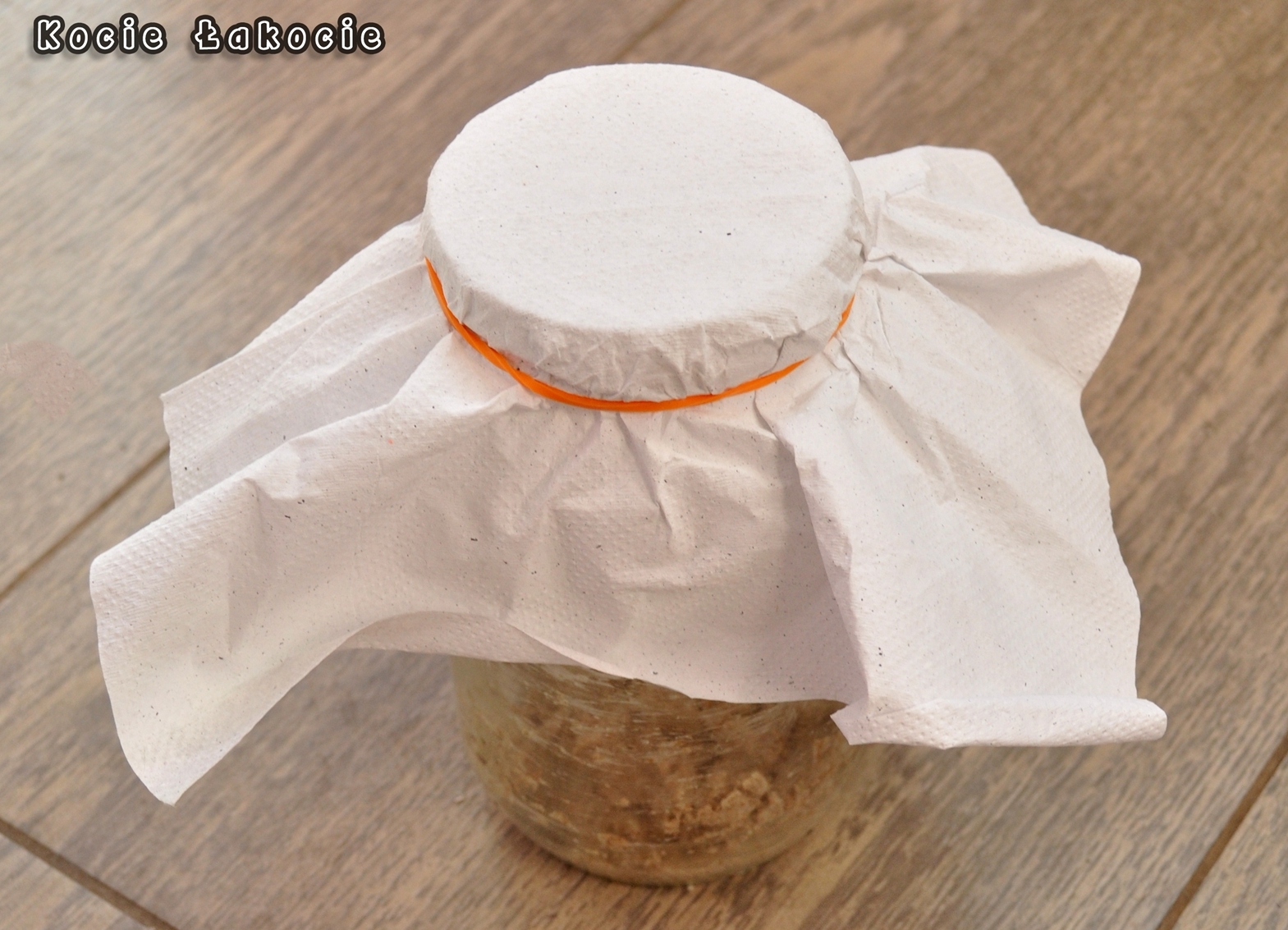 Poza tym słoika nigdy nie można zakręcać! Czy go hodujemy, aktywujemy czy przechowujemy w lodówce zakwas zawsze musi mieć czym oddychać. Dlatego najlepiej przykryć go za każdym razem ręcznikiem papierowym/gazą i nałożyć gumkę.