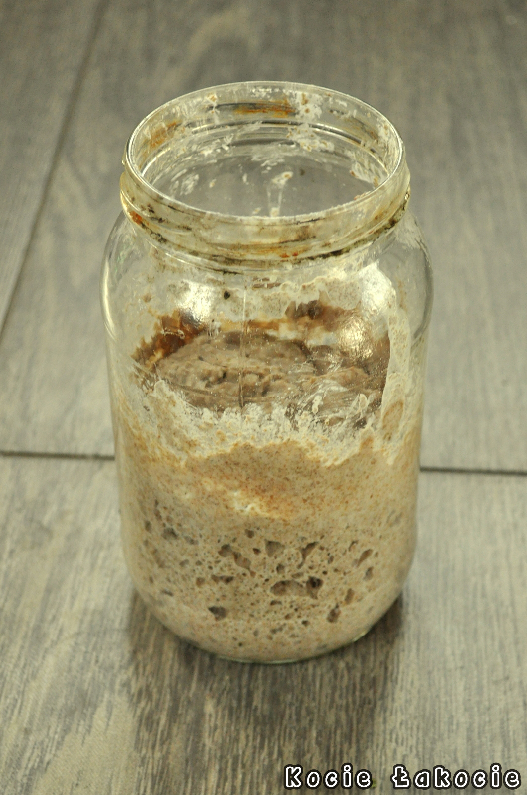 Za każdym razem kiedy chcemy upiec chleb, trzeba wyjąć zakwas z lodówki, dodać po 50g wody i mąki (ta ilość wody i mąki jest dość orientacyjna i zależy od tego, ile zakwasu potrzebujemy i ile mamy go obecnie w słoiku. Jeśli potrzebujemy 80g zakwasu, jak do zwykłego żytniego chleba, to wystarczy dodać po te 50g, ale jeśli robimy chleb gryczany, gdzie potrzeba 170g zakwasu, to dodajemy po 100g wody i mąki. Poza tym jeśli przy jednej aktywacji dodaliśmy za dużo wody i mąki i mamy dużo zakwasu, to przy kolejnej zmniejszamy ilość składników i odwrotnie. Zawsze jednak ilość – w masie! – dodawanej wody i mąki musi być taka sama). Następnie trzeba wszystko to w słoiku wymieszać i odstawić w ciepłe miejsce na ok. 12 godzin. Chodzi o to, aby zakwas urósł i pojawiło się w nim dużo pęcherzyków powietrza. Po tym czasie możemy go użyć do zrobienia masy chlebowej.